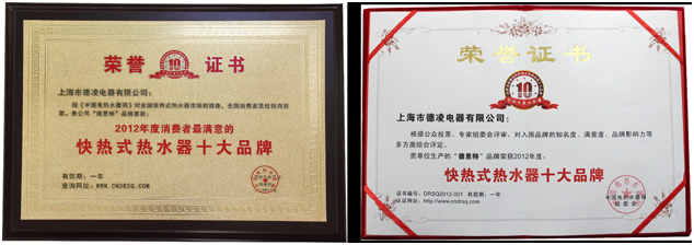 經“中國電熱水器網”(www.cndrsq.com)對全國快熱式電熱水器市場的調查以及全國消費者和經銷商的投票,德恩特快熱式電熱水器獲得“2012年度消費者最滿意的快熱式熱水器十大品牌”,并榮獲第一名。